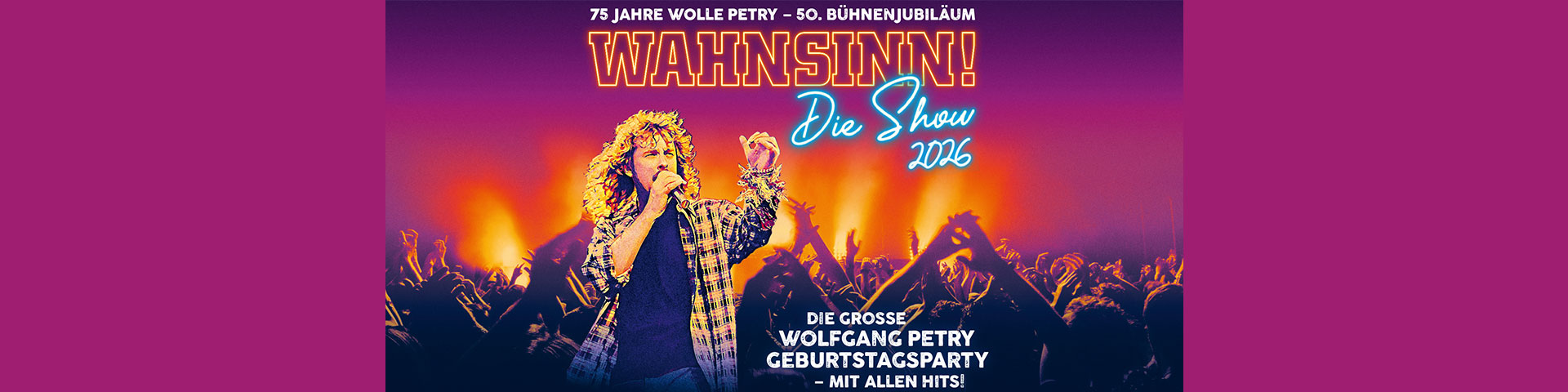 Das ist die vermutlich beste Nachricht des noch jungen neuen Jahres: Der WAHNSINN geht weiter! „Wahnsinn – Die Show“ kommt 2026 als grosse Wolfgang Petry Geburtstagsparty zurück auf die Bühne. Es ist das Jahr, in dem Wolle seinen 75. Geburtstag feiert sowie sein 50. Bühnenjubiläum hätte! Wenngleich er nicht mehr selbst auf der Bühne steht, so haben seine Fans den größten Spaß, all seine Hits und Ohrwürmer zu feiern. „Wahnsinn – Die Show 2026“ – bietet nicht nur jede Menge Wolfgang Petry-Hits, sondern ist gleichzeitig eine atemberaubende Zeitreise, die bewegende Momente, unterhaltsame Geschichten und persönliche Anekdoten aus Wolfgang Petrys Karriere noch einmal aufleben lässt. Die Show, die 2026 bereits zum 5. Mal stattfinden wird, stellt die Musik und Original-Songs der Schlagerikone in den Mittelpunkt und feiert in 2026 die grosse Wolfgang Petry Geburtstagparty – mit all seinen Hits wie Verlieben, verloren, vergessen, verzeihen, Der Himmel brennt und natürlich auch Wahnsinn.
