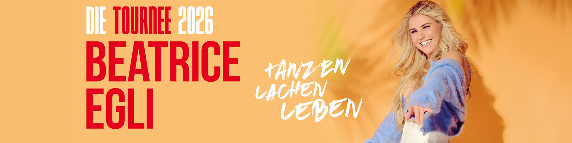 Beatrice Egli ist ein Star mit Herz und Seele. Mit jedem Song, jeder Zeile transportiert die Schweizerin pure Emotion und wird dank ihrer positiven Ausstrahlung zur Botschafterin für Lebensfreude und Selbstbewusstsein. Sehr zur Freude ihrer Fans kündigte die Schlager-Ikone ihre mit Spannung erwartete neue Tournee „Tanzen – Lachen – Leben“ und damit ihre Rückkehr auf die Bühne für 2026 an. Ab Ende September nächsten Jahres wird die Sängerin rund 20 Konzerte in Deutschland, Österreich und der Schweiz geben und ihre Fans in ihre ganz persönliche Welt mitnehmen.